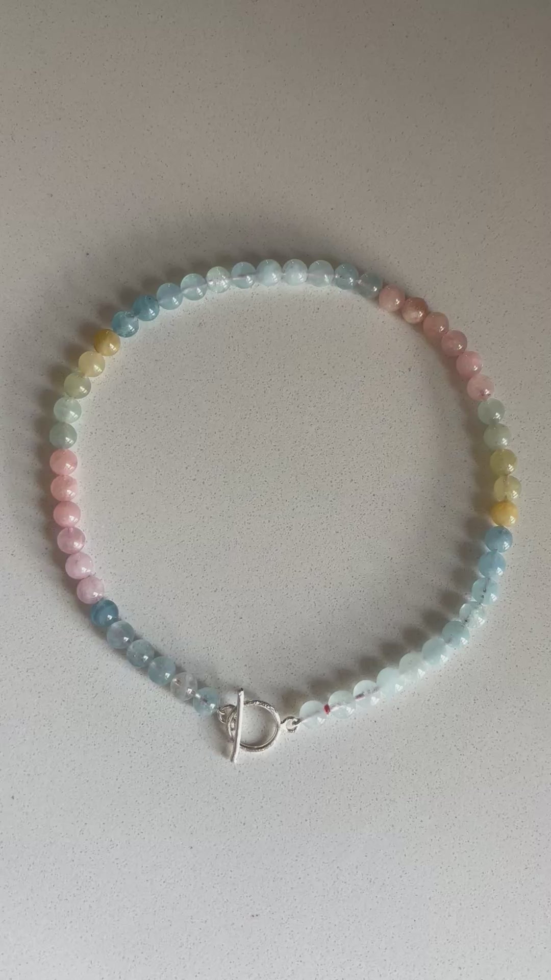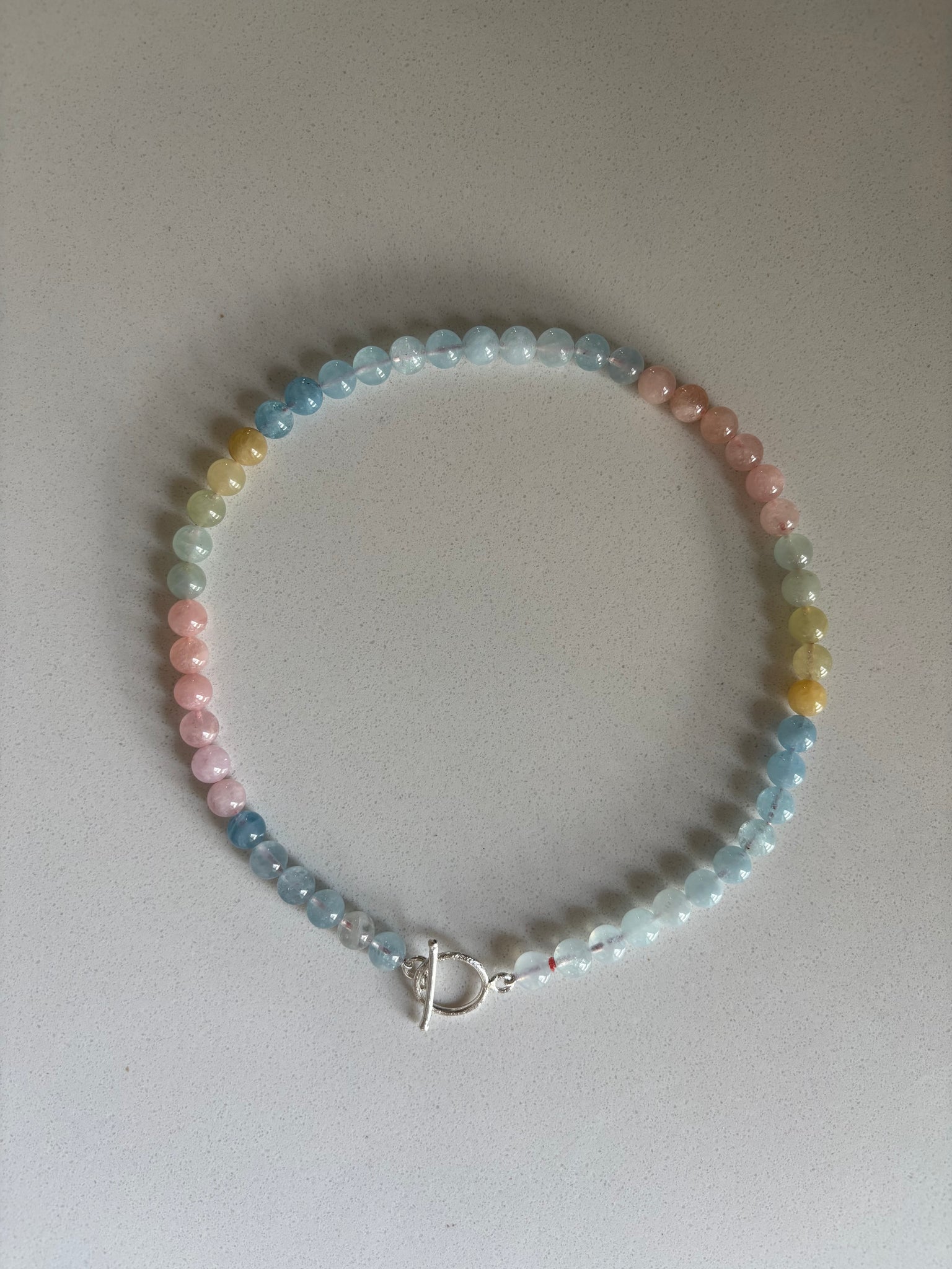 Sommerlich-bunte Beryll-Perlen mit einem silbernen Knebelverschluss.