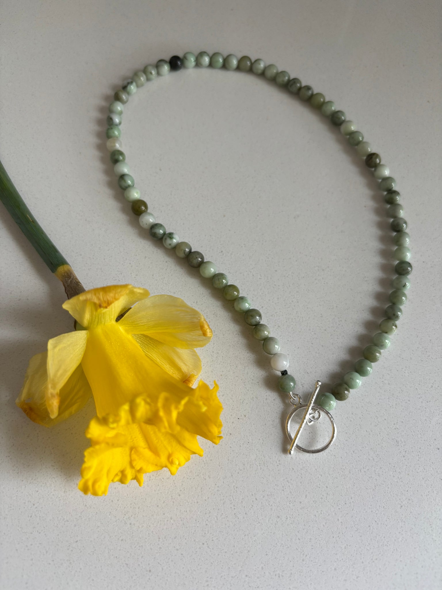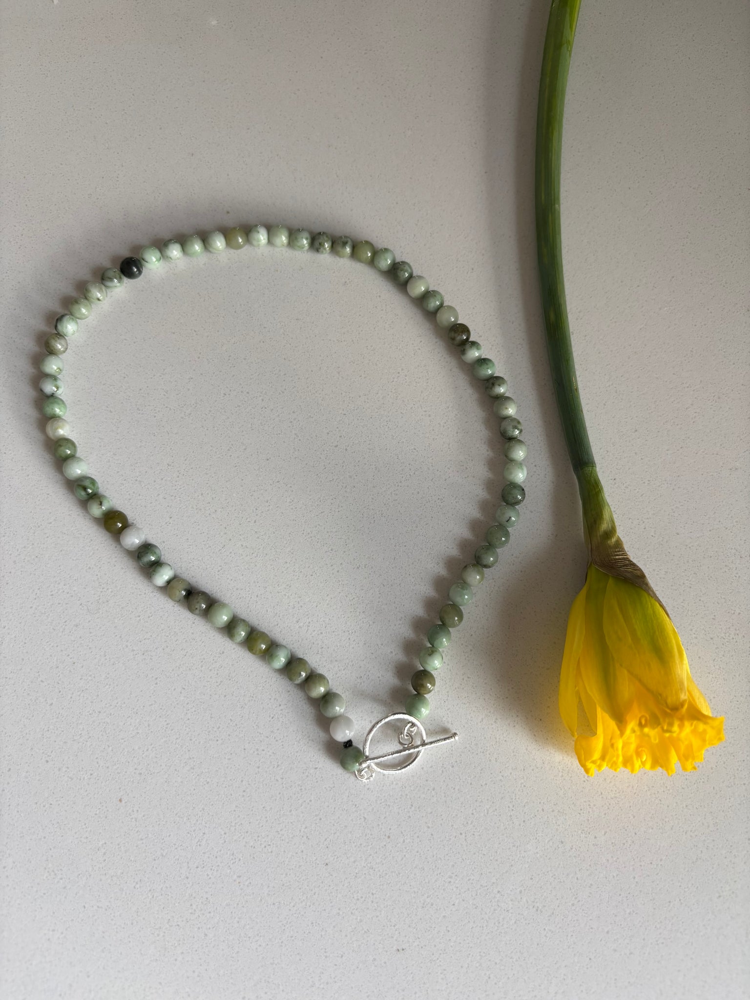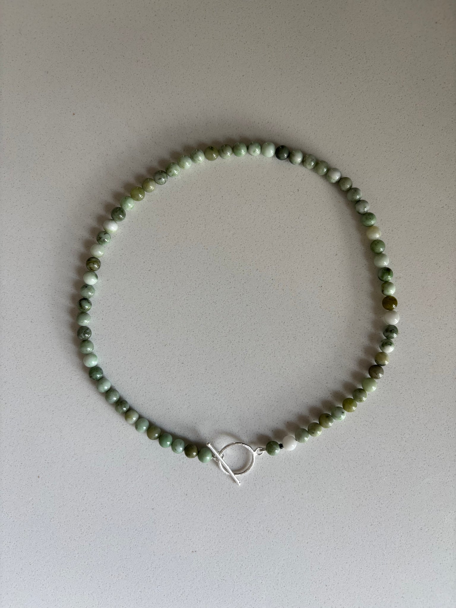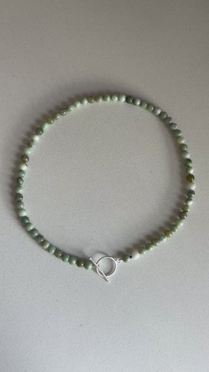 Grüne Jade-Perlenkette mit einem silbernen Knebelverschluss.