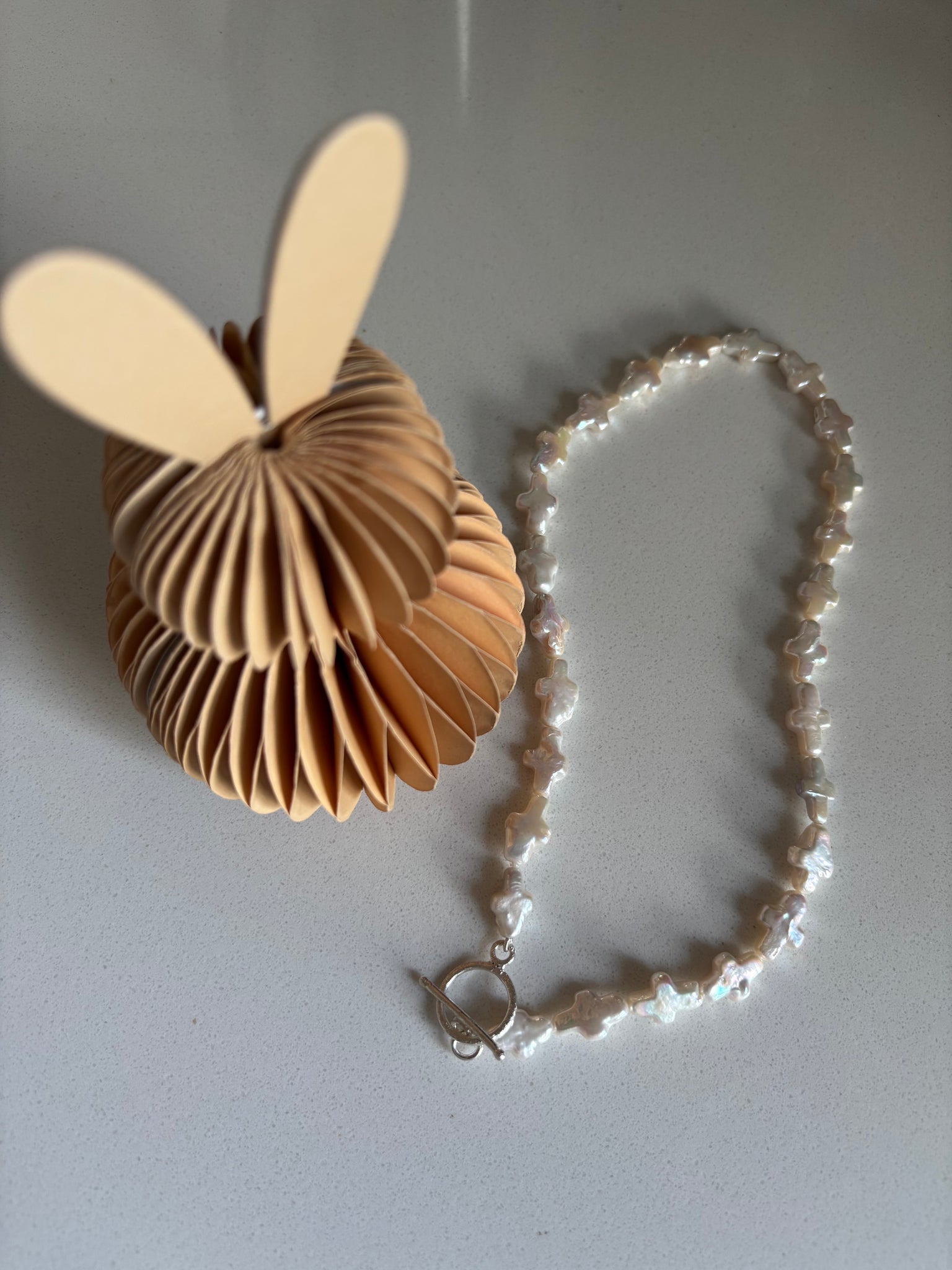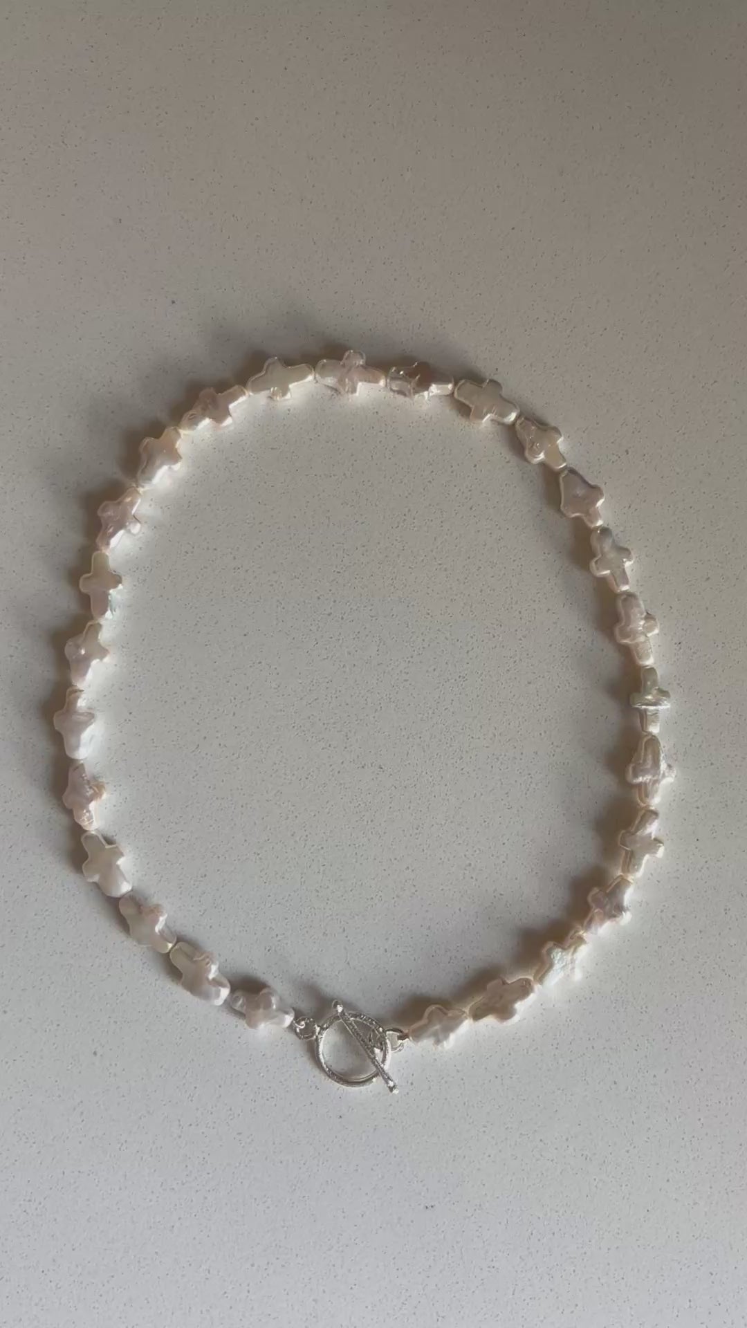 Schimmernde Süßwasserzuchtperlen im Cross Shape mit einem silbernen Knebelverschluss.